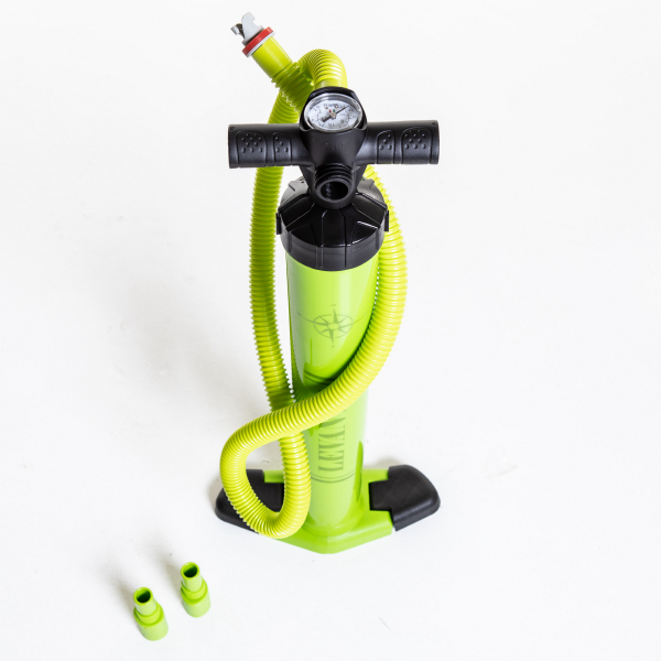 Helppokäyttöinen pumppu painemittarilla, jossa on kääntyvät jalkatuet ja kätevä T-kahva. Soveltuu Airtrackeille ja muille Air-tuotteille kuten puomeille, blockeille jne.