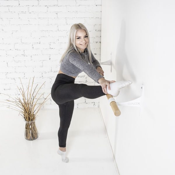 Omaa tyylikästä ja laadukasta Dinox tuotantoa, joka sisältää koivuisen kauniin lakatun balettitangon valkoisilla seinäkannakkeilla. Tukeva malli, joka on helppo kiinnittää seinään haluamalleen korkeudelle. Balettitanko tulee 20 cm päähän seinästä, joten se mahdollistaa kaikki baletin harjoitteet. Kannattimien kohdat ovat vapaasti valittavissa tangolla.