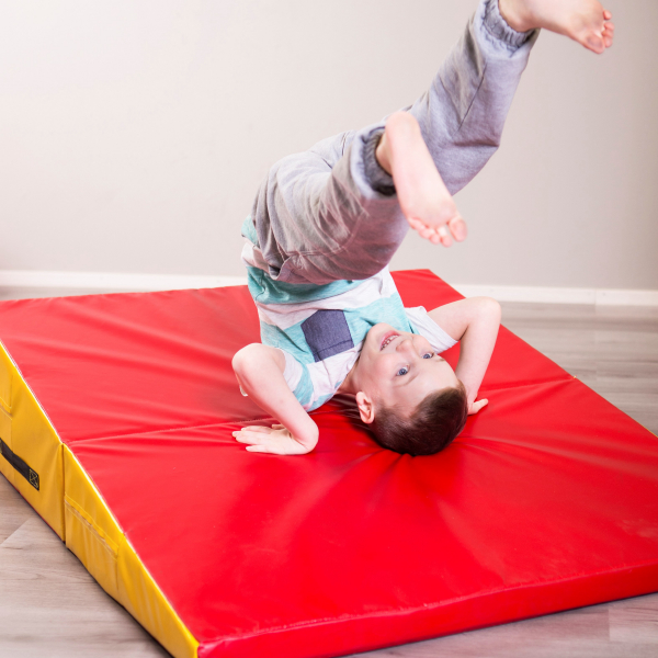 Kantokahvoilla varustettu pehmeä kuperkeikkakiila on taittuvuutensa ansiosta näppärä liikuteltava ja varastoitava. Toinen alapinta liukuestekangasta.