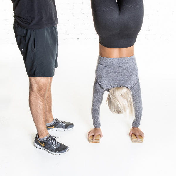 Käsilläseisontaharjoituksiin käsilläseisontapalikat, joiden tavoitteena on saada harjoittajalle parempi kontrolli käsilläseisontaan. Alapinnassa liukueste.