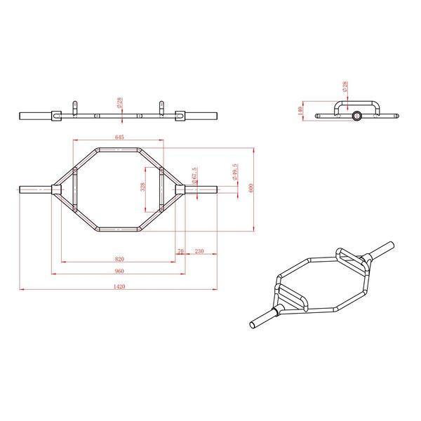 Saat miellyttävän neutraalin otteen maastavetoihin ja hyvän otepidon karhennetusta Ø28mm otetangosta. Soveltuu 50mm levypainoille. Paino: 23kg. Max kantavuus: 250kg.
