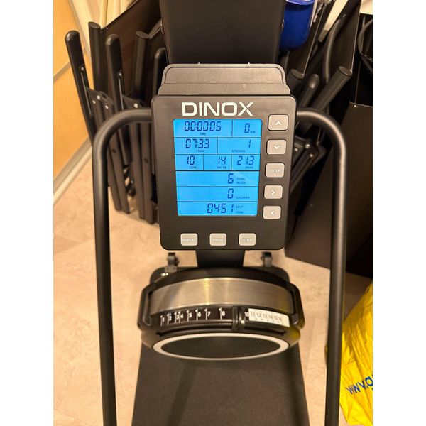 Dinoxin vetolaitteen näyttö on erittäin selkeä, ja siitä löytyy harjoittelun kannalta kaikki oleellinen tieto yhdellä vilkaisulla: vetofrekvenssi, käytetty aika, vedetty matka ja syke. Näytössä hetkellisen vauhdin ilmaisin heittelee vedon vaiheen mukaan turhan paljon, mutta aika per 500 metriä toimii tasaisen vauhdin ilmaisimena loistavasti.