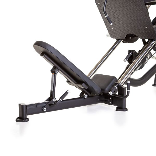 Tukeva ja korkealaatuinen levypainokuormitteinen jalkaprässi kovaan kuntosalikäyttöön. Laite on varustettu isokokoisella jalkalevyllä, joka mahdollistaa monipuolisen jalkojen asettelun ja liikeratojen vaihtelun. Näin voit kohdistaa harjoittelun tehokkaasti eri alavartalon lihasryhmiin. Selkänoja on ergonomisesti muotoiltu ja tukee liikkeen aikana. Rakenne on erittäin vakaa ja kelkka liikkuu sulavasti myös suurilla kuormilla. Raskaaseen käyttöön suunnitellut painotapit kestävät jopa 400 kg kuormituksen.