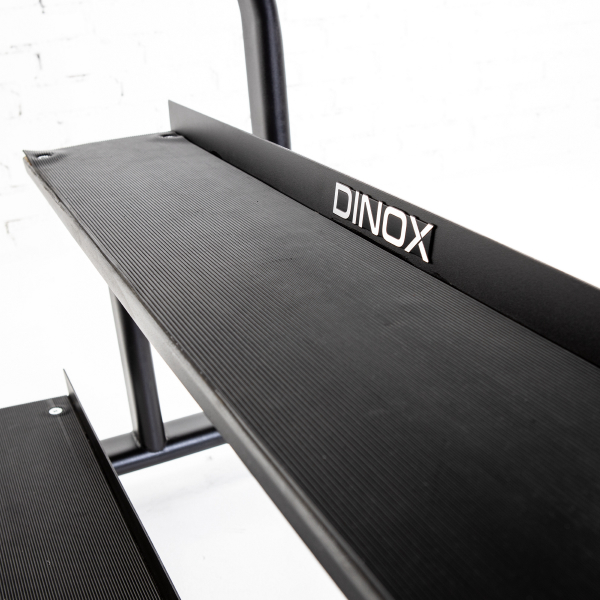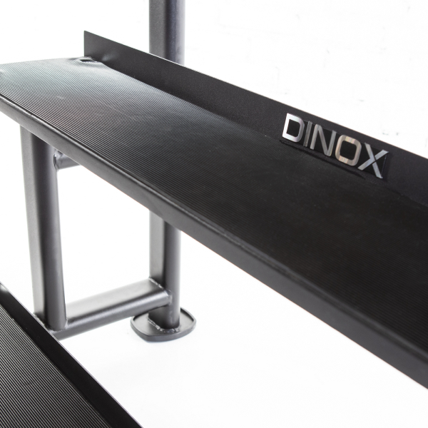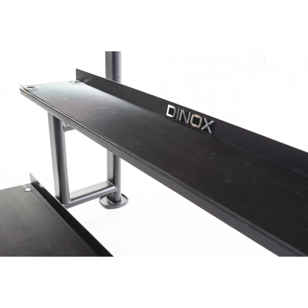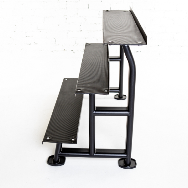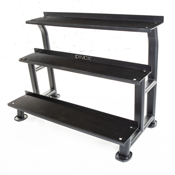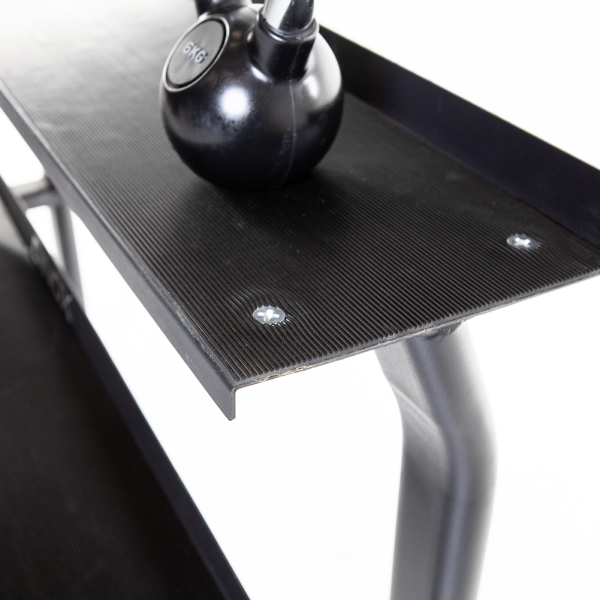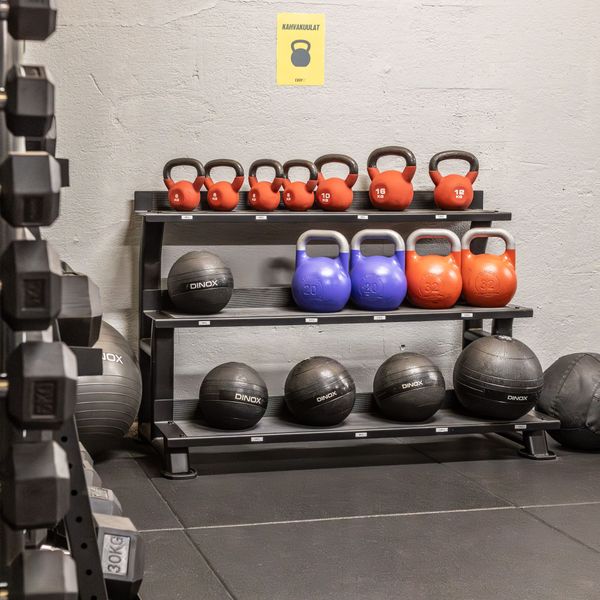 Hyllytasoja on kolme ja jokaisella tasolla on liukuestepinta ja takareunassa reunakoroke, joten kahvakuulat tai käsipainot pysyvät hyvin hyllyillä.