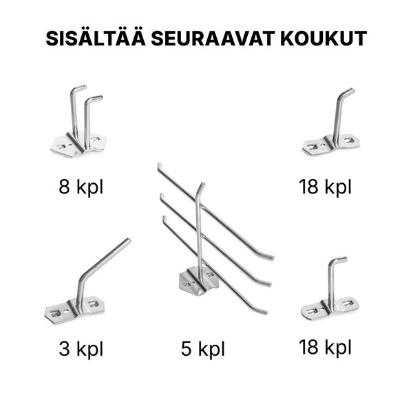 Kaksipuolinen rakenne tuo reilusti säilytystilaa, mutta vie vain vähän lattiatilaa. Koukkuihin on helppo ripustaa esimerkiksi vastuskuminauhoja, taljakahvoja, painonnostovöitä ja kehonhuoltovälineitä, jotka muuten jäävät helposti lojumaan lattioille. Kun välineillä on oma selkeä paikkansa, tila pysyy siistinä ja varusteet löytyvät nopeasti käyttöön. Vahva teräsrunko on suunniteltu kestämään kovaa päivittäistä kuntosalikäyttöä.
