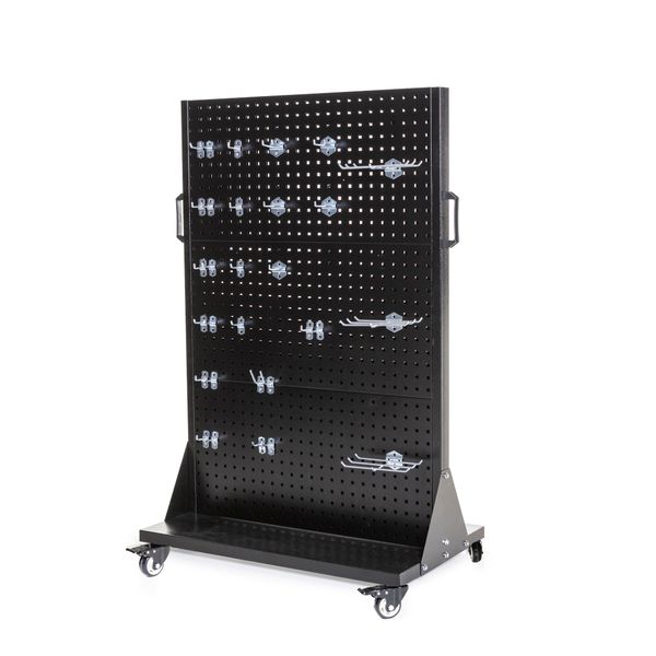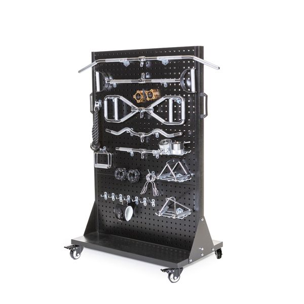 Helppo ja toimiva säilytysratkaisu, joka pitää harjoitteluvälineet siististi omilla paikoillaan ja aina käden ulottuvilla. Kaksipuolinen rakenne, koukut ja siirtopyörät helpottavat arkea kuntosaleilla.