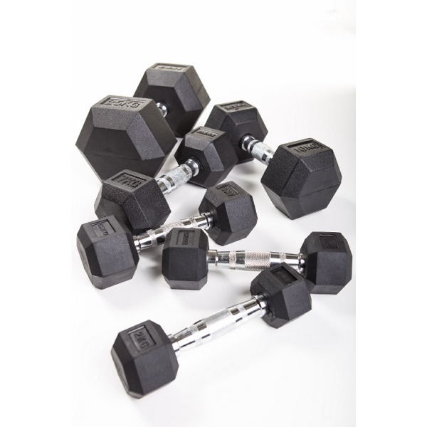 Kumipintaiset käsipainot kovaan ammattikäyttöön kuntosalille. Hexagon Käsipainot ovat myös aloittelijoille hyvä valinta luotettavan laatunsa puolesta. Käsipainojen paino-osat ovat kuusikulmaiset jolloin voit hyödyntää niitä esimerkiksi punnerruksissa, käsinseisontatukina jne. Kumipinta estää lattioiden naarmuuntumisen ja hexagonin muoto painojen vierimisen.