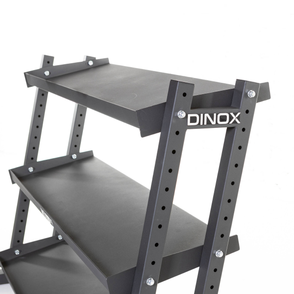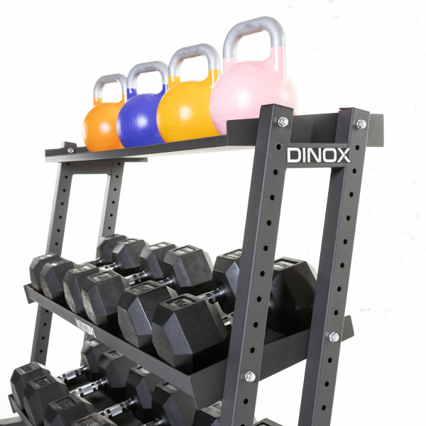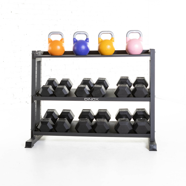 Monikäyttöinen 3-tasoinen säilytysteline, jonka tasojen korkeudet ja kaltevuudet on kätevästi säädettävissä. Hyllyjen kaltevuuden säätö mahdollistaa sen monikäyttöisyyden eri kuntoiluvälineille. Teline sopii siis erinomaisesti käsipainojen, kahvakuulien, kuntopallojen ja muiden kuntovälineiden säilytykseen, ja sen järeä metallirakenne takaa tukevuuden ja vakauden ilman huojumista, vaikka hyllyt olisivat täydessä kuormituksessa.Teline on ihanteellinen säilytysratkaisu niin kotikuntosaleille kuin ammattikäyttöön. Telineen kantavuus jopa 500 kg.