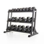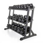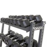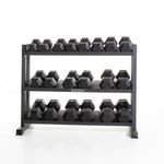 Kattava 475 kg setti Hexagon käsipainoja ja laadukas kolmitasoinen käytännöllinen säilytysteline, jossa voit itse määritellä käyttötarkoituksesta riippuen metallihyllyjen sijainnin ja kaltevuuden. Metallihyllyjen korokereuna pitää turvallisesti 475 kg Hexagon käsipainoa kaltevilla hyllyllä, joista on nopea ottaa käsipainon harjoitusvälineeksi. Todella kattava setti kuntosaleille kovaan salikäyttöön. Järeä metallinen teline kannattelee huojumatta käsipainot ja on kestävyydeltään ylivertainen.