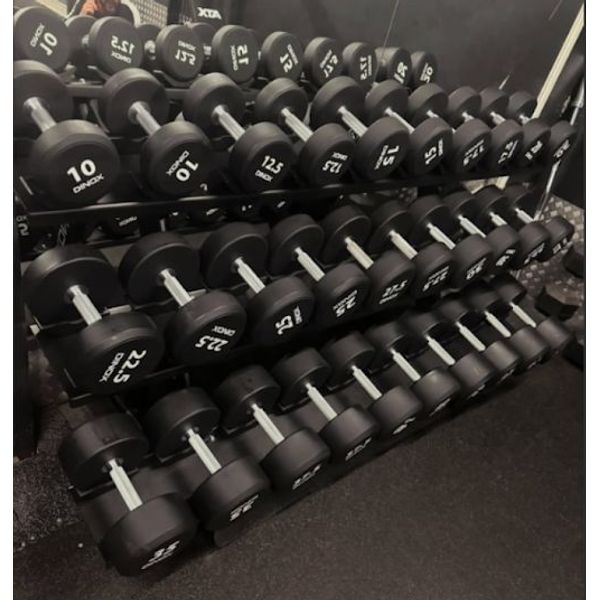 Kolmitasoinen erittäin vankkarakenteinen käsipainoteline, johon mahtuu 15 paria käsipainoja. Soveltuu kuntosalikäyttöön. Telineessä on käsipainosatulat, jotka pitävät pyöreät käsipainot turvallisesti paikoillaan. Käsipainosatulat ovat myös irroitettavissa, jolloin telineen käyttö soveltuu myös muille käsipainomalleille kuten hexagoneille. Telineen lisäksi tilaukseen voi lisätä suoraan 15 paria Dinox Pro TPU käsipainoja, jolloin yhdellä toimituksella saa heti telineen käyttöön.