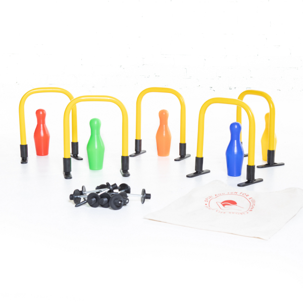 Sisä- ja ulkokäyttöön soveltuva keila- ja porttisetti, jossa vain mielikuvitus on rajana. Monipuolinen pelisetti esim. päiväkoti- ja kotikäyttöön. Mukana kankainen säilytyspussi. Setin paino: 700g.