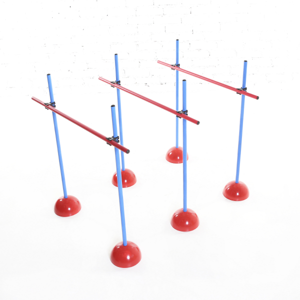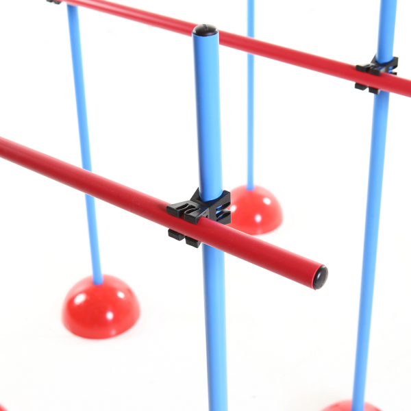 Pujottelukepit jalustoihin ja klipseillä poikittaiskepit kiinni pystykeppeihin. Näin nopeasti on täysin itsesi räätälöimä esterata valmis! Asettamalla eri pituisia keppejä maahan jalustoihin ja rakentamalla kepeistä kiinnitysklipsien avulla aitoja voit luoda esimerkiksi keppariradan tai estejuoksuharjoitusradan.