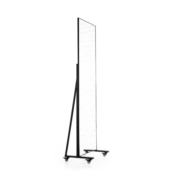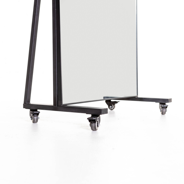 Nelipyöräisellä jalustalla varustettu pystymallinen liikuteltava kokovartalopeili on erinomainen peili esimerkiksi fysioterapiaan tai kuntosalille. Herkästi kääntyvät pyörät helpottavat peilin liikuttelua peilin otekahvoista. Turvakalvoitus peilin takana turvallisuuden lisäämiseksi.