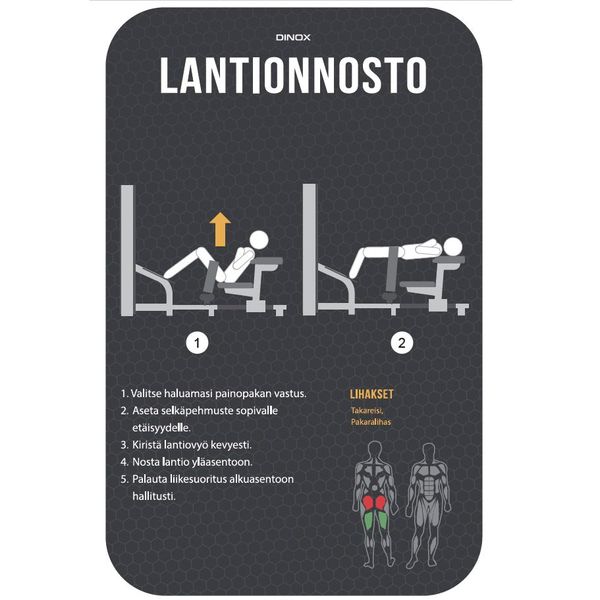 Dinox Lantionnostolaite kuuluu jokaisen salin perusvälineistöön. Sen upea design on pelkistetty ja ajaton. Lantionnostolaitetteen satiinin musta sävy on tyylikäs ja soveltuu siksi erinomaisesti tilaan kuin tilaan. Dinox Lantionnostolaitteen suunnittelun lähtökohtana on ollut laite, joka mahdollistaa täydellisen liikeradan pakaralihasten harjoittamiseen.