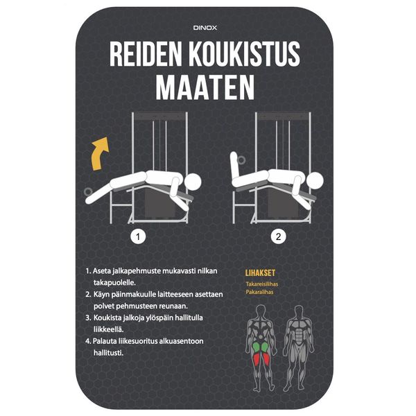 Dinox Reiden koukistajalaite maaten on varustettu 7-portaisella vastusrullan asentosäädöllä sekä ergonomisesti muotoilulla penkillä. Tukiotekahvojen otepinta on kuminen, joten ote pitää hyvin. Reiden koukistajalaite maaten on hyvä harjoite, kun haluat vahvistaa takareiden lihaksistoa. Laitteen kulmat on optimoitu niin, että takareisien harjoittelu on erittäin tehokasta mutta samalla miellyttävän tuntuista. Takareisiä maaten tehtäessä on erittäin helppo kohdistaa vastus juuri takareisien lihaksiin.