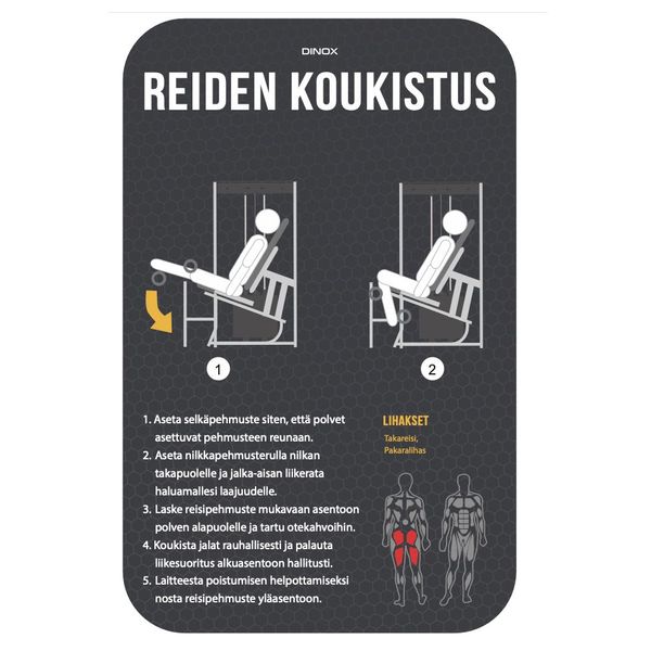 Dinox Reiden koukistuslaite istuen kuuluu jokaisen salin perusvälineistöön. Sen upea design on pelkistetty ja ajaton. Reiden koukistuslaitteen satiinin musta sävy on tyylikäs ja soveltuu siksi erinomaisesti tilaan kuin tilaan. Dinox Reiden koukistuslaitteen suunnittelun lähtökohtana on ollut laite, joka mahdollistaa täydellisen liikeradan takareisilihasten harjoittamiseen.