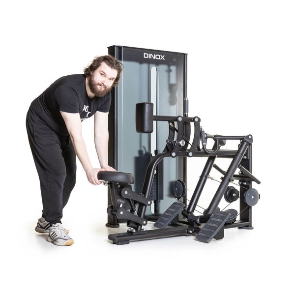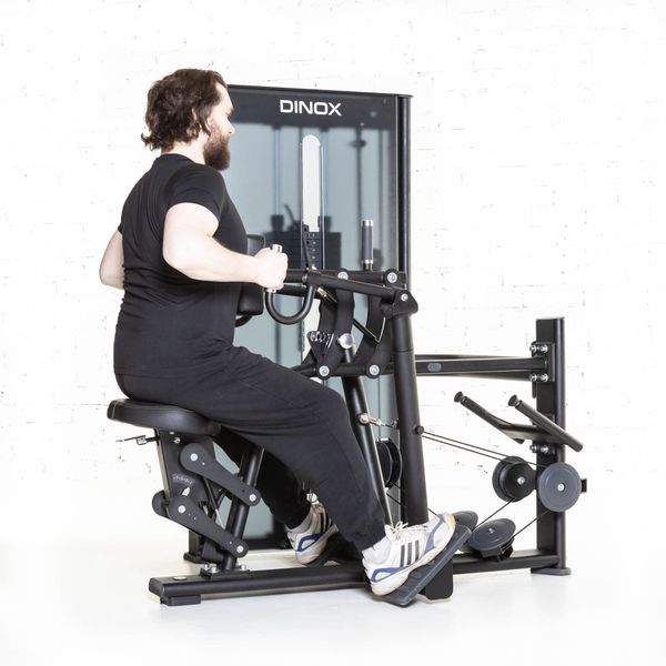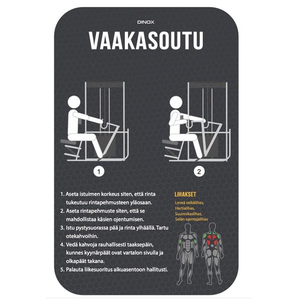 Dinox Vaakasoutulaite on varustettu kaasujousiavusteisella istuinsäädöllä ja etunojapehmusteen korkeussäädöllä, joten saat juuri sopivan vartalollesi sopivan asennon riippumatta siitä oletko pitkä vai lyhyt. Kahvojen tartuntaotepinta on kuminen, joten ote pitää hyvin. Erilliset liikevarret mahdollistavat harjoitteen yhdellä tai kahdella kädellä. Yhdellä kädellä tehtäessä on vielä helpompi kohdistaa liike juuri oikeaan kohtaan selkälihaksissa. Yhden käden harjoitteessa laitteesta löytyy tähän käyttötarkoitukseen suunniteltu lisätukikahva, jonka ansiosta saat harjoitteesta maksimaalisen hyödyn. Laite aktivoi laajalti isoja sekälihaksia. Liike vaikuttaa erityisesti selän puoliväliin mutta myös hauiksiin ja takahartioihin. Erityisesti lapojen seutu aktivoituu erinomaisesti tällä laitteella.