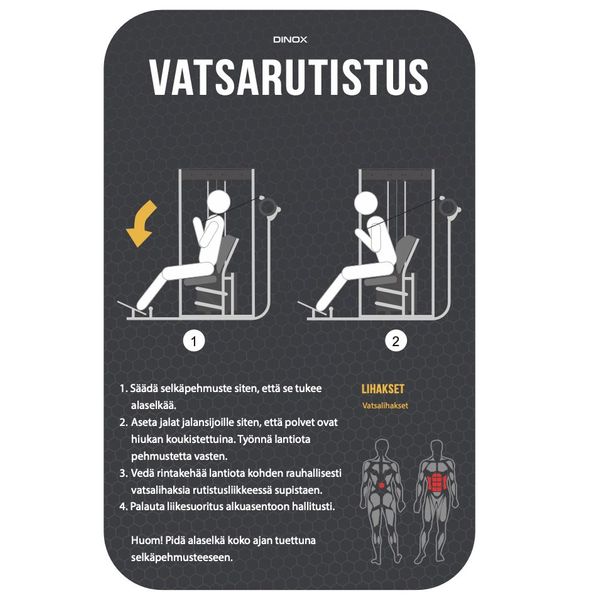 Dinox Vatsarutistuslaite on varustettu kaasujousiavusteisella istuinsäädöllä, sekä säädettävällä selkätuella pikalukituksen kera. Istuimen korkeussäätö tapahtuu helposti ja saat hyvän optimaalisen asennon luontevalle vatsarutistusliikkeelle. Näin saat laitteella luontevan rutistusliikkeen hallitusti rullaten selkä mahdollisimman pyöreäksi ja supistaen suorilla vatsalihaksilla jokaisen toiston lopussa. Laitteen oteaisat ovat moniotteiset hyvällä pidolla ja näin ollen mahdollistavat liikkeen keskittymisen pelkästään vatsalihaksiin syviä vatsalihaksia myöten.
