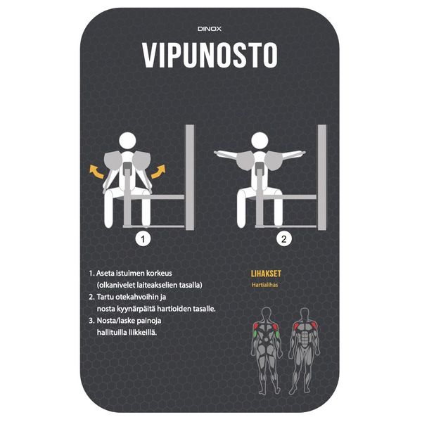Dinox Vipunostolaitteella saat juuri sinun kehollesi ergonomisesti toimivan liikkeen ja liikkeestä toiseen voi siirtyä nopeasti vain oman kehon asentoa muuttamalla. Laite on varustettu kaasujousiavusteisella istuinsäädöllä ja etunojapehmusteen korkeussäädöllä, joten saat juuri sopivan vartalollesi sopivan asennon riippumatta siitä oletko pitkä vai lyhyt. Suorana laitteessa istuessasi harjoitus ottaa isoihin olkalihaksiin / olkavarsiin ja etunojassa harjoite ottaa takaolkalihaksiin, jotka niin usein jäävät ilman harjoitetta. Laitteella saat tehtyä myös seisten yksi olkavarsi kerrallaan olkapäätreenin, jolloin kuorman ja harjoitteen keskittyminen voi yksilöidä paremmin haluamaansa harjoitettavaan lihakseen.