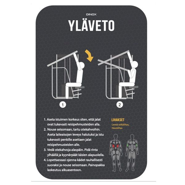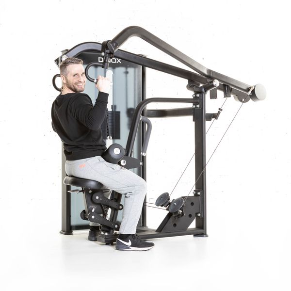 Dinox Ylävetolaite Series Pro kuuluu jokaisen salin perusvälineistöön. Sen upea design on pelkistetty ja ajaton. Ylävetolaitteen musta sävy on tyylikäs ja soveltuu siksi erinomaisesti tilaan kuin tilaan. Dinox Ylävetolaitteen suunnittelun lähtökohtana on ollut laite, joka mahdollistaa täydellisen liikeradan leveiden selkälihasten harjoittamiseen.