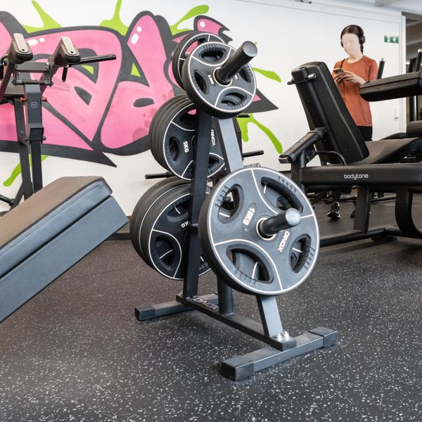 Pystymallisessa levypainotelineessä on kuusi paikkaa 50 mm reiällä oleville levypainoille ja erillinen paikka lukoille. Kumipäällysteiset jalat pitävät levypainotelineen tukevasti paikallaan naarmuttamatta lattiaa.