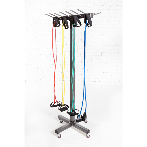 Nyt vastuskuminauhasi pysyvät järjestyksessä eivätkä mene solmuun. Telineeseen mahtuu jopa 140 kahvakuminauhaa. Telineessä on pyörät, jotka helpottavat telineen siirtelyä.