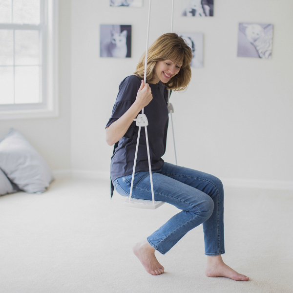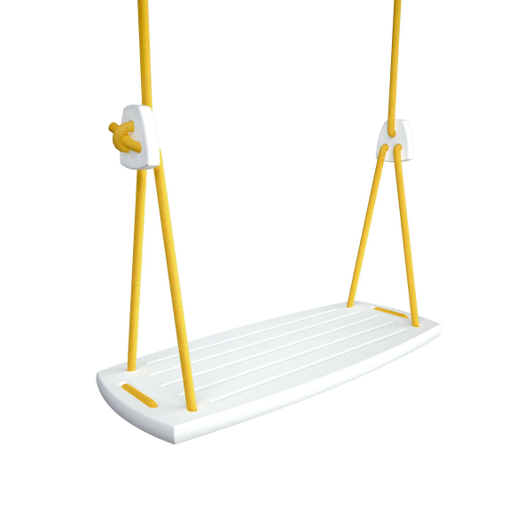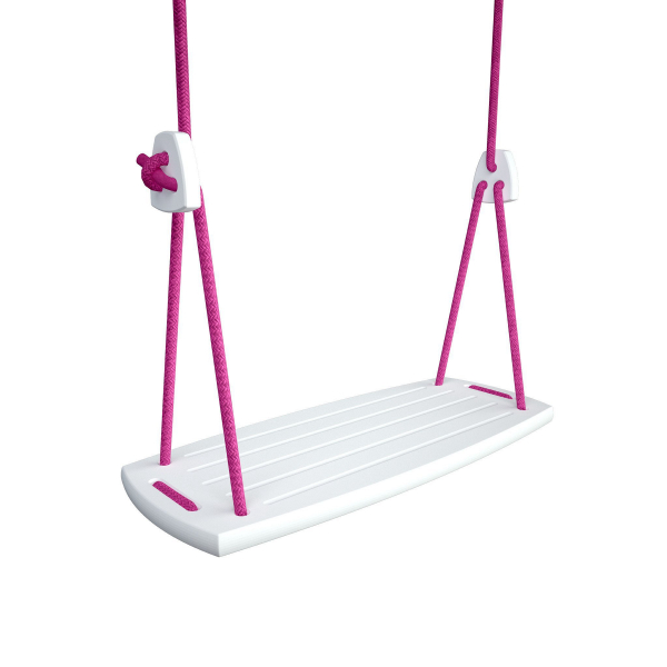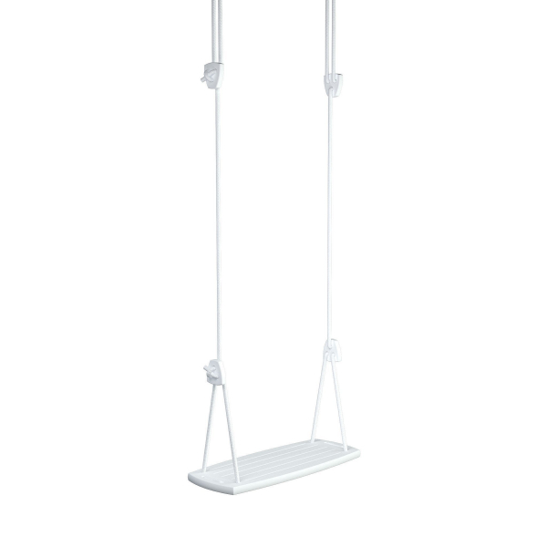 Valkoiseksi maalattu koivu sointuu kauniisti yhteen eri väristen köysien kanssa. Kestävän istuimen ansiosta keinulla voi keinua aikuisetkin.