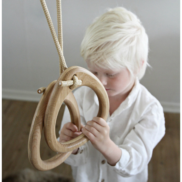 Tyylikkäät voimistelurenkaat Lillagungalta! Kauniit ja käytännölliset renkaat temppuiluun ja roikkumiseen. Materiaalina öljytty tammi. Max. käyttäjäpaino: 90kg.