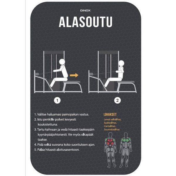 Dinox Alataljalaite Series Pro kuuluu jokaisen salin perusvälineistöön. Sen upea design on pelkistetty ja ajaton. Alataljalaitteen musta sävy on tyylikäs ja soveltuu siksi erinomaisesti tilaan kuin tilaan. Dinox Alataljalaitteen suunnittelun lähtökohtana on ollut laite, joka mahdollistaa täydellisen liikeradan selkälihasten harjoittamiseen.