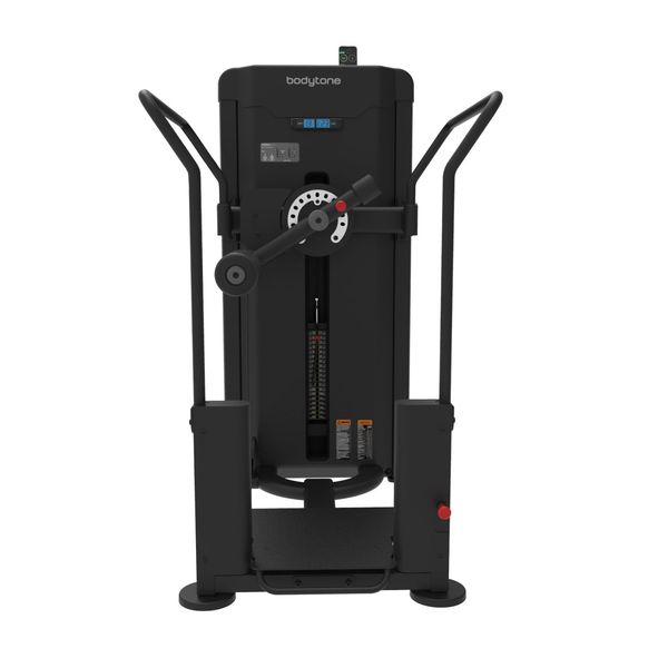Luistamattomat PVC-kahvat takaavat mukavan otteen harjoituksen aikana. Laitteen 91 kg:n painopakassa on värikoodatut painolevyt ja magneettinen painonvalitsin. Lisäksi siinä on ruostumattomasta teräksestä valmistetut liukuputket ja PVC-pinnoitetut teräskaapelit, jotka takaavat erittäin hiljaisen ja turvallisen liikkeen.