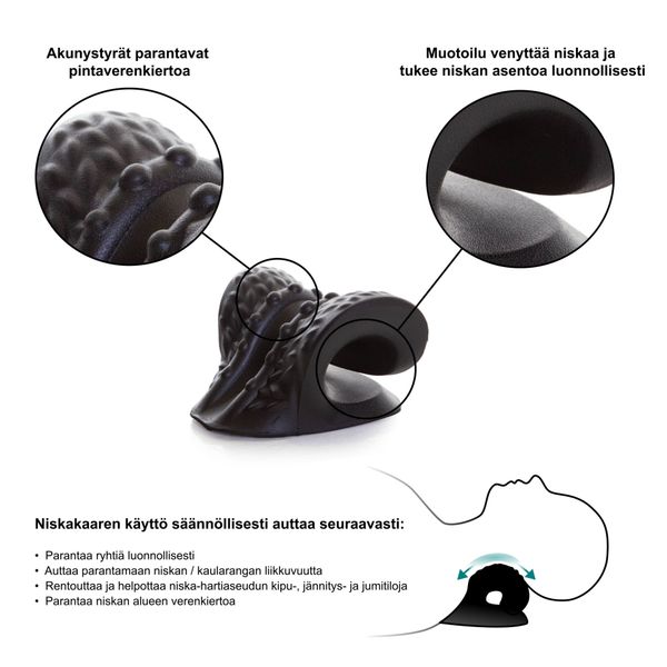 Rentouttava apu niska-hartiaseudun kiputiloihin ja jännitykseen. Niskakaari auttaa ylläpitämään niskan oikeaa ja luonnollista asentoa. Se notkistaa nikamia ja parantaa kaularangan liikkuvuutta vapauttamalla niska-hartiaseudun jännitys- ja jumitiloja. Näin ollen kaularanka palautuu luonnolliseen asentoonsa, ryhti paranee sekä niskan alueen verenkierto paranee. Optimaalinen 26 asteen kulma!