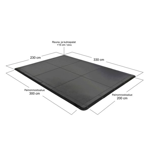 Painonnostoalustan mitat ovat ilmaistu harjoittelualueen koon mukaan. Eli esim. painonnostoalustan harjoittelualueen koko on 300 x 200 cm, mutta kokonaismitta reuna- ja kulmapalojen kanssa on 330 x 230 cm. Alustaan tulee siis reuna- ja kulmapalojen kanssa +15 cm lisää leveyttä / sivu.