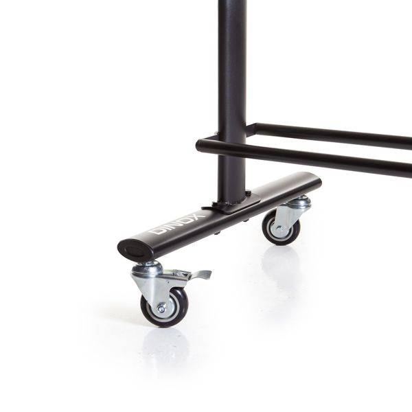 Metallirunko pitää telineen vakaana myös täyteen lastattuna. Kolme vaakatasoa tarjoavat runsaasti säilytystilaa useille eri kokoisille palloille. Telineessä on neljä pyörää, joista kaksi lukittavaa. Voit siirtää telineen kevyesti paikasta toiseen ja lukita sen tukevasti haluttuun kohtaan.