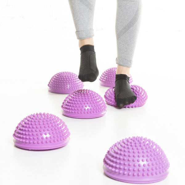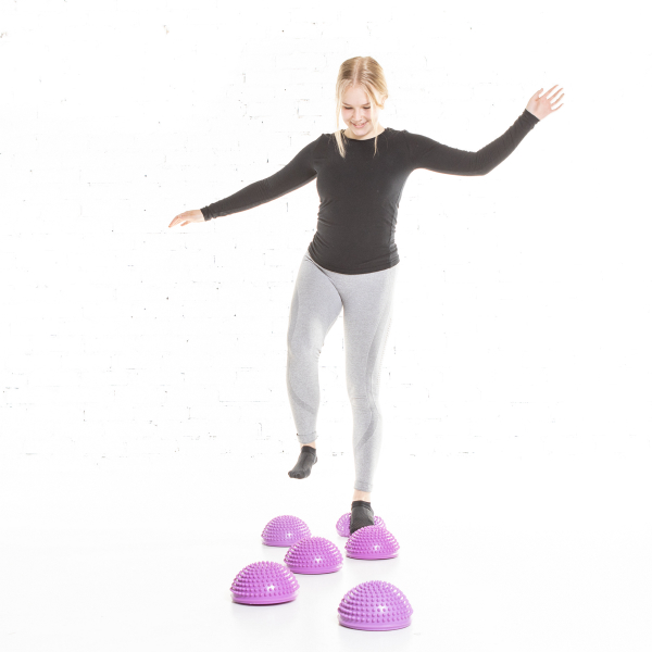 Tuplahyödylliset askelsaarekkeet, jotka kehittävät tasapainoasi ja samalla aktivoivat jalkapohjien kautta verenkiertoasi. Pehmeät jalan alla joustavat puolipallon muotoiset askelsaarekkeet ovat mahtava väline myös lasten tasapainoiluun esteradoilla tai leikeissä.