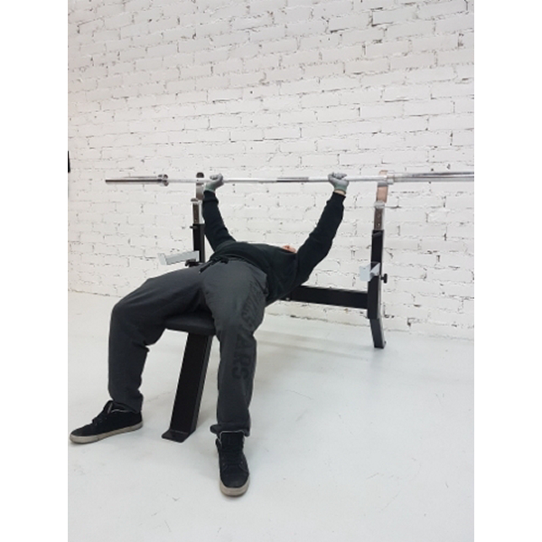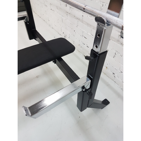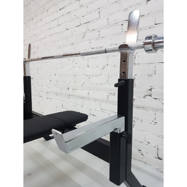 Tässä penkkipunnerruspenkissä on helposti erikokoisille käyttäjille säädettävät tangonpidikkeet. Penkkiosa on pehmustettu ja päällystetty kestävällä materiaalilla.