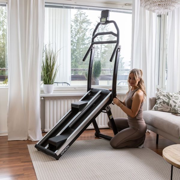 Porraskone Dinox Stair Climber Home on kompakti, mutta äärimmäisen tehokas kunnonkohottaja kotiin. Porraskone Dinox mahdollistaa kokonaisvaltaisen treenin pienessä tilassa. Kiipeävä, luonnollinen liike aktivoi yhtä aikaa useita suuria lihasryhmiä kuten jalkoja, pakaroita ja keskivartaloa, sekä saa sykkeen nopeasti nousemaan. Porrasliike polttaa jopa kolme kertaa enemmän kaloreita kuin juoksumattoharjoittelu, mutta samalla kuormittaa niveliä vähemmän.