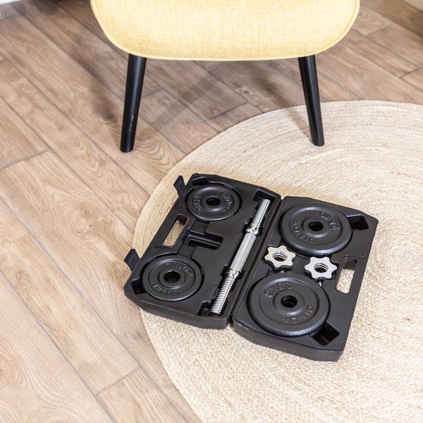 Kompaktin kokoinen Säädettävä valurautainen käsipaino, joka on muokattavissa 2,5 - 15kg:n välillä. Sisältää 6 x levypaino, 1 x käsipainotanko ja 2 x kierrelukko, joiden säilytys ja kuljetus on helppoa mukana tulevassa säilytyssalkussa.