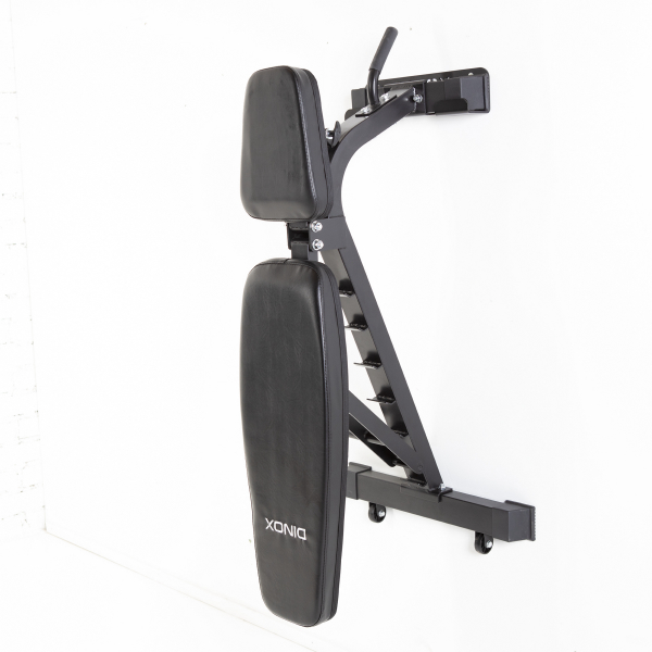 Kun treenit on ohi, voit nostaa penkin seinälle niin se ei vie lattiatilaa ja ole tielläsi. Kannatin on metallia ja mukana tulee kiinnitystarvikkeet.