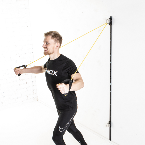Seinäkiinnitteinen Space Saver Gym on monipuolisen vastuskuminauhatreenin mahdollistava tilaihme kotiisi. Ankkurikiskoissa on metalliset koukkuankkurit, joissa on helppo klikki-mekanismi korkeuden siirtoa varten. Näin pystyt nopeasti muuttamaan vastuskuminauhalla treenattavien lihasten kohdetta. Kiskoja on setissä kaksi.