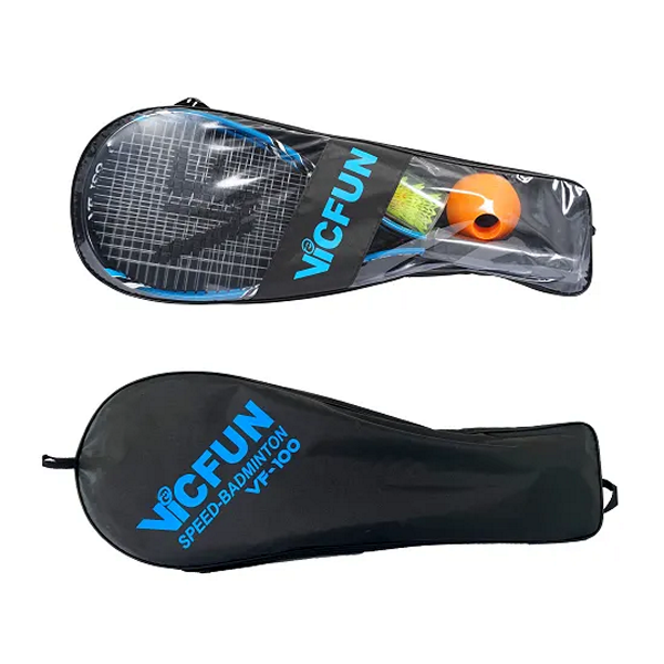 Settiin kuuluu kaksi alumiinimailaa, kolme nopeaa sulkapalloa, kahdeksan oranssia kenttämerkkiä sekä kestävä säilytyslaukku kantohihnalla.