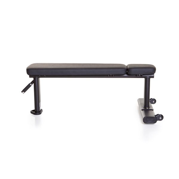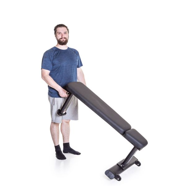 Kuntosalikäyttöön soveltuva tasapenkki, jota on helppo siirrellä siirtorenkaiden ja siirtokahvan ansiosta. Mitat: P 132 cm, L 70cm, K 46cm.
