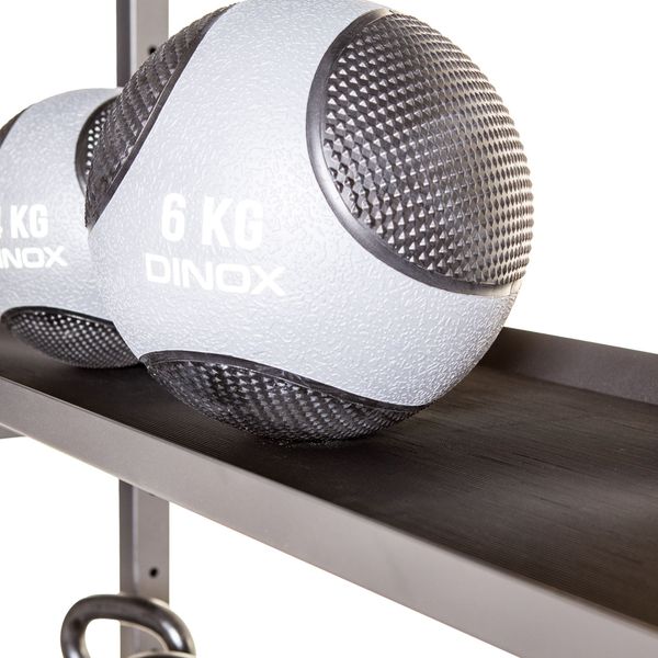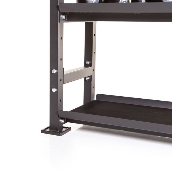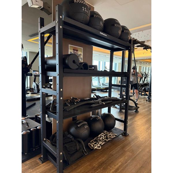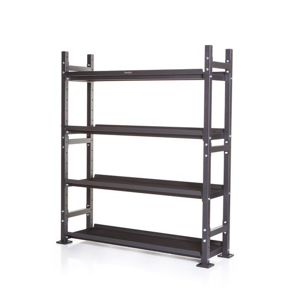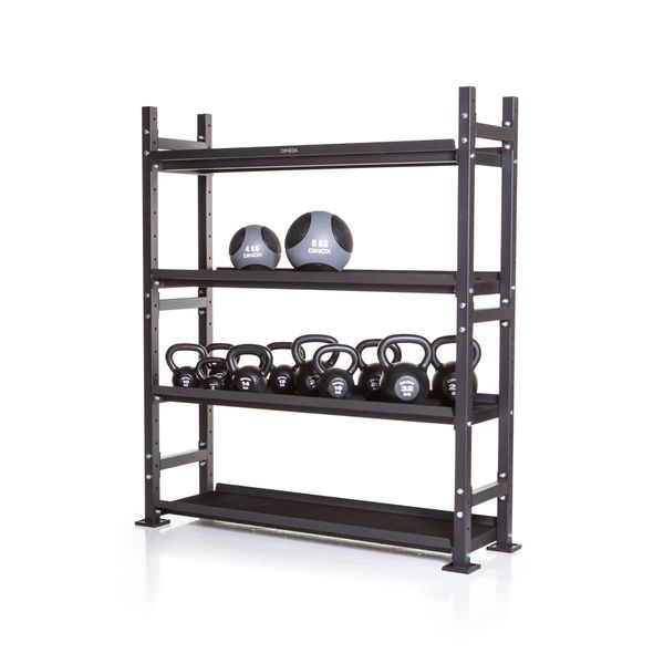 Säilytysteline sopii erinomaisesti esimerkiksi kahvakuulien, käsipainojen, Wall Ball -pallojen, lisäpainojen, vastuskuminauhojen, taljakahvojen ja muiden harjoitteluvälineiden säilytykseen. Säilytystelineen avoin ja tilava rakenne tekee välineiden esillepanosta siistiä ja helposti saavutettavaa. Hyllytasojen pinnalla on liukuestepinnoite, jonka ansiosta tuotteet pysyvät jämäkämmin paikoillaan, sekä välineiden liikuttelu ei aiheuta turhaa kolinaa. Lisäksi hyllykön jaloissa olevat "kumitassut" säästävät mukavasti lattiapintoja.