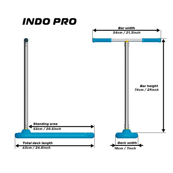 Indo Pro trampoliiniscootti on suunniteltu käyttäjille, jotka haluavat parasta. Verrattuna aiempiin malleihin PRO tarjoaa temppuiluun paremman kontrollin, johtuen uudesta nopeasta Indo Compression systeemistä, paremmasta painojakaumasta, lisääntyneestä koosta ja painosta. Dekki on isompi ja painavampi kuin X70 malleissa ja sen painopiste on alempana. Tämä tuo lisää vakautta temppuihin. Lisäksi dekki on aikaisempaa jäykempi.
