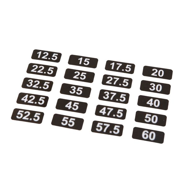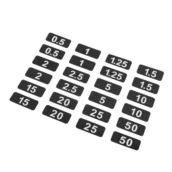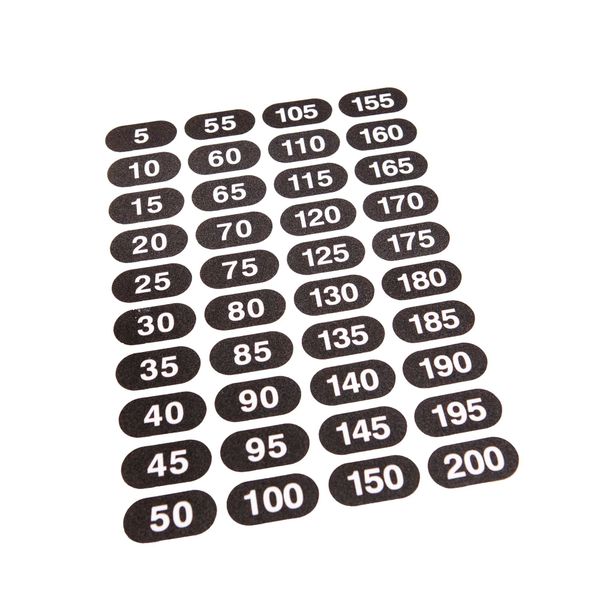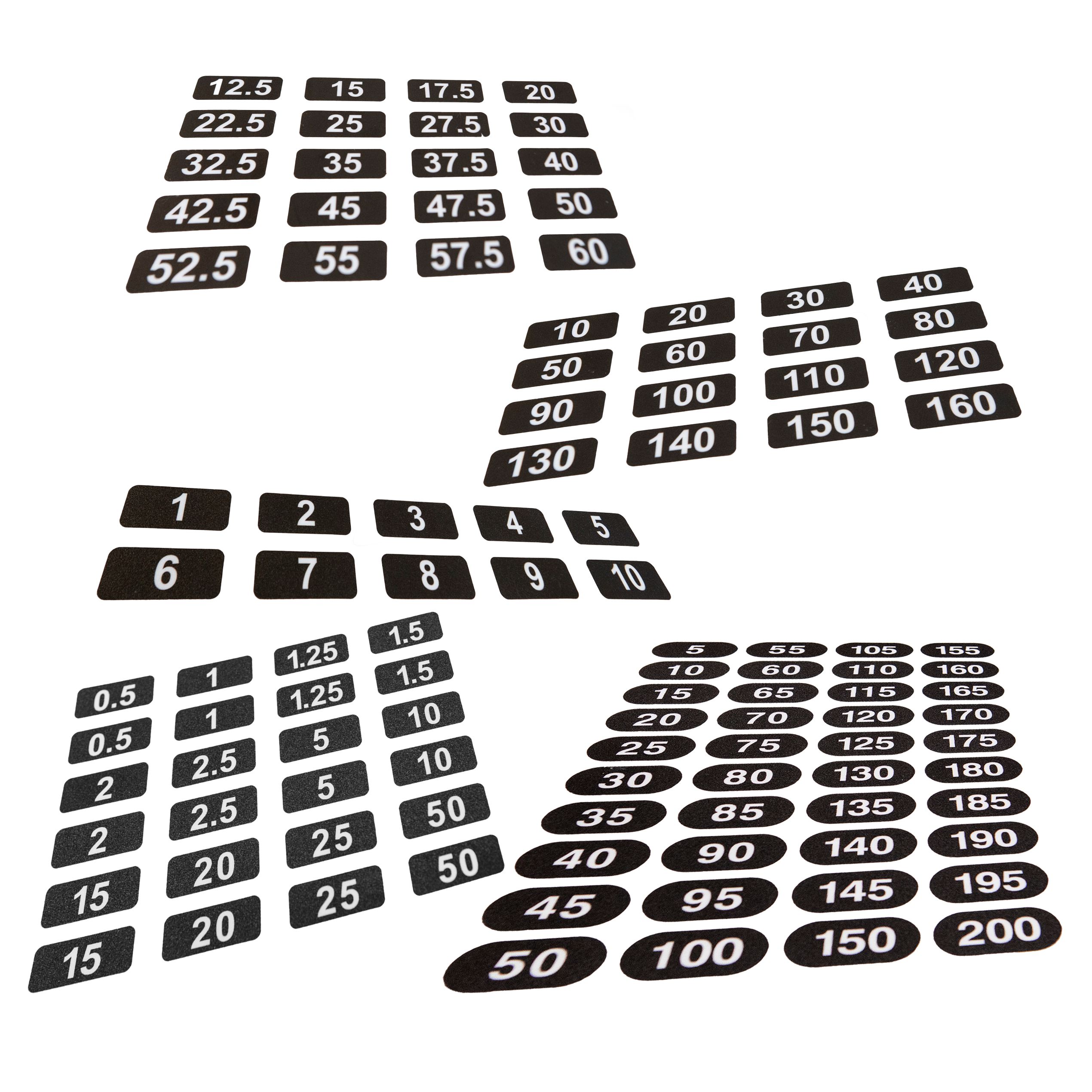 Tarranumeroarkki selkeisiin painomerkintöihin kuntosalille. Sopii mm. käsipainotelineisiin ja painopakkalaitteisiin. Saatavilla neljällä erilaisella numeroinnilla olevat tarra-arkit.
