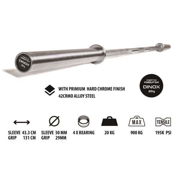 Voimanostotanko Dinox 20 kg on suunniteltu noudattaen Kansainvälisen Voimanostoliiton (IPF - International Powerlifting Federation) teknisiä sääntöjä. Voimanostotanko on valmistettu erikoisteräksestä ja suojattu kromipinnoitteella, sekä siinä on erittäin korkeat mekaaniset ominaisuudet. Dinox Voimanostotankoa voidaan käyttää kilpailuissa ja salilla kuin myös vaativassa kotikäytössä.