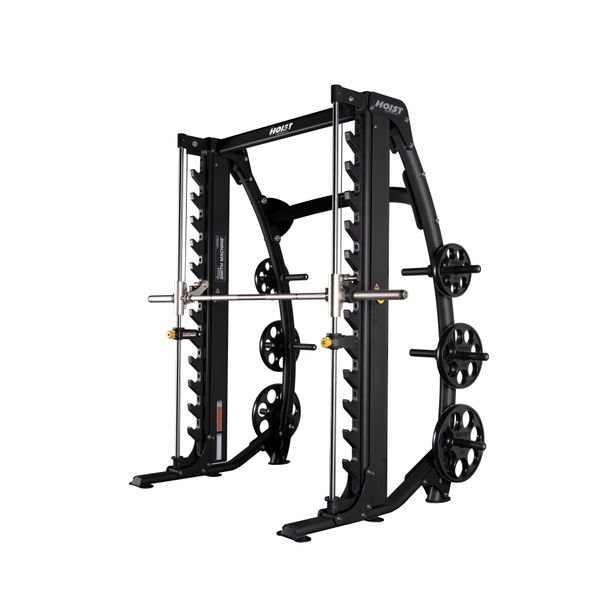 HOIST CF-3755 Dual Angle Smith on kuntosalikäyttöön suunniteltu monipuolinen ja vakaa voimateline, joka voidaan koota joko perinteiseen pystysuoraan asentoon tai 7 asteen kulmaan. Kaksikulmainen rakenne tuo harjoitteluun vaihtelua ja mahdollistaa eri liikeradat samalla laitteella, mikä lisää liikkeiden luonnollisuutta ja mukautuvuutta eri harjoitteisiin ja käyttäjiin. Helppokäyttöiset turvastopparit lisäävät turvallisuutta, ja TPU-päällysteiset tangon laskupinnat vähentävät ääntä sekä suojaavat runkoa, tehden käytöstä miellyttävää ja hiljaista myös vilkkaassa saliympäristössä.